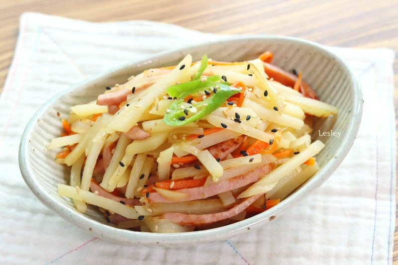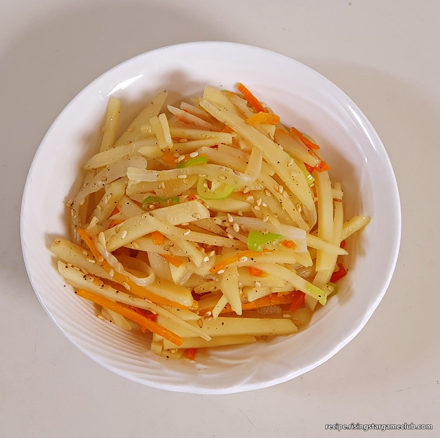 껍질을 벗긴 후 얇게 썰어서 물에 헹구어 전분을 제거해 주세요. 전분을 제거하지 않으면 나중에 팬 바닥에 달라붙기 때문에 헹궈서 제거해야 합니다.