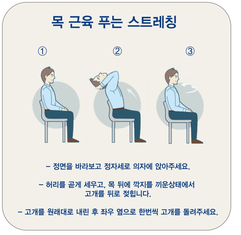 2. 시선이 천장을 바라보듯이 턱을 들어올리거나 하나~2~310초 견디고 3. 시선이 바닥을 바라보듯 고개를 숙여 1~2~3,10초 버티는 기본 스트레칭을 하면