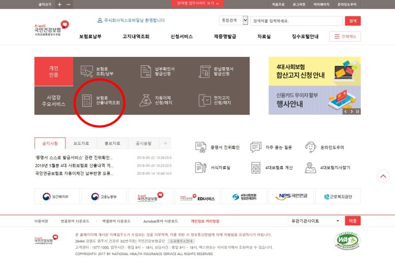 메인화면 | 에이치웰 국민의료보험 및 사회보장증후군포털 개인인증 사업장 로그인 알림 보도자료 전달공지 2021년 9월 4대 보험료 산정내역 공개시간 2021-09-17 10:02:00.0 (조치완료) 보험료 안내 납부 및 환급 안내 계좌등록오류 참고실 4대 보험료 계산 4대 보험영업점 찾기 Back to top si4n.nhis.or.kr